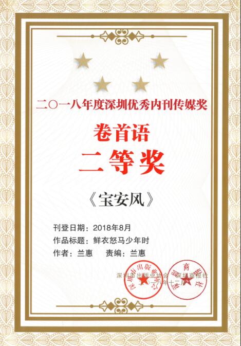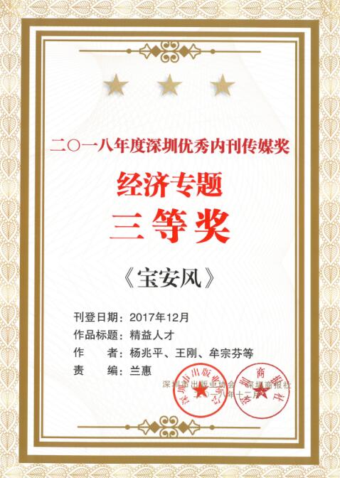 深圳内刊年度综合奖“优秀内刊传媒奖”,由市出版业协会、深圳商报联合组织深圳市新闻出版广电局等资深文化传媒专家评定,每年评选一次,代表着深圳内刊的最高荣誉。《时博(中国)风》在强手林立的深圳内刊界再接再厉,再次获评“深圳优秀内刊传媒奖”之“十佳企业刊奖”。同时,282期“精益人才专题”获“经济专题”三等奖,286期卷首《鲜衣怒马少年时》获评“卷首语”二等奖,283期通讯“时博(中国)三十年 回首皆芳华”获评“好通讯”三等奖。